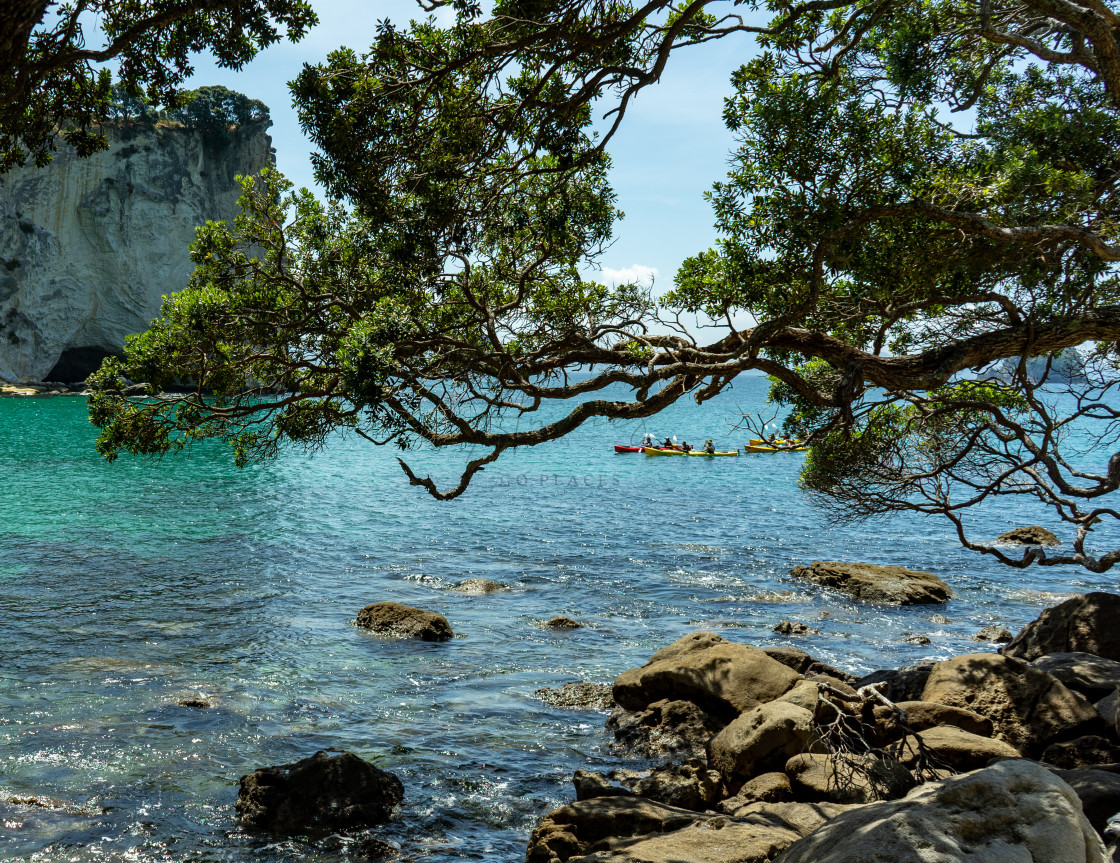 Kayakers visible through tree branches in the bay near Coromandel Peninsula
